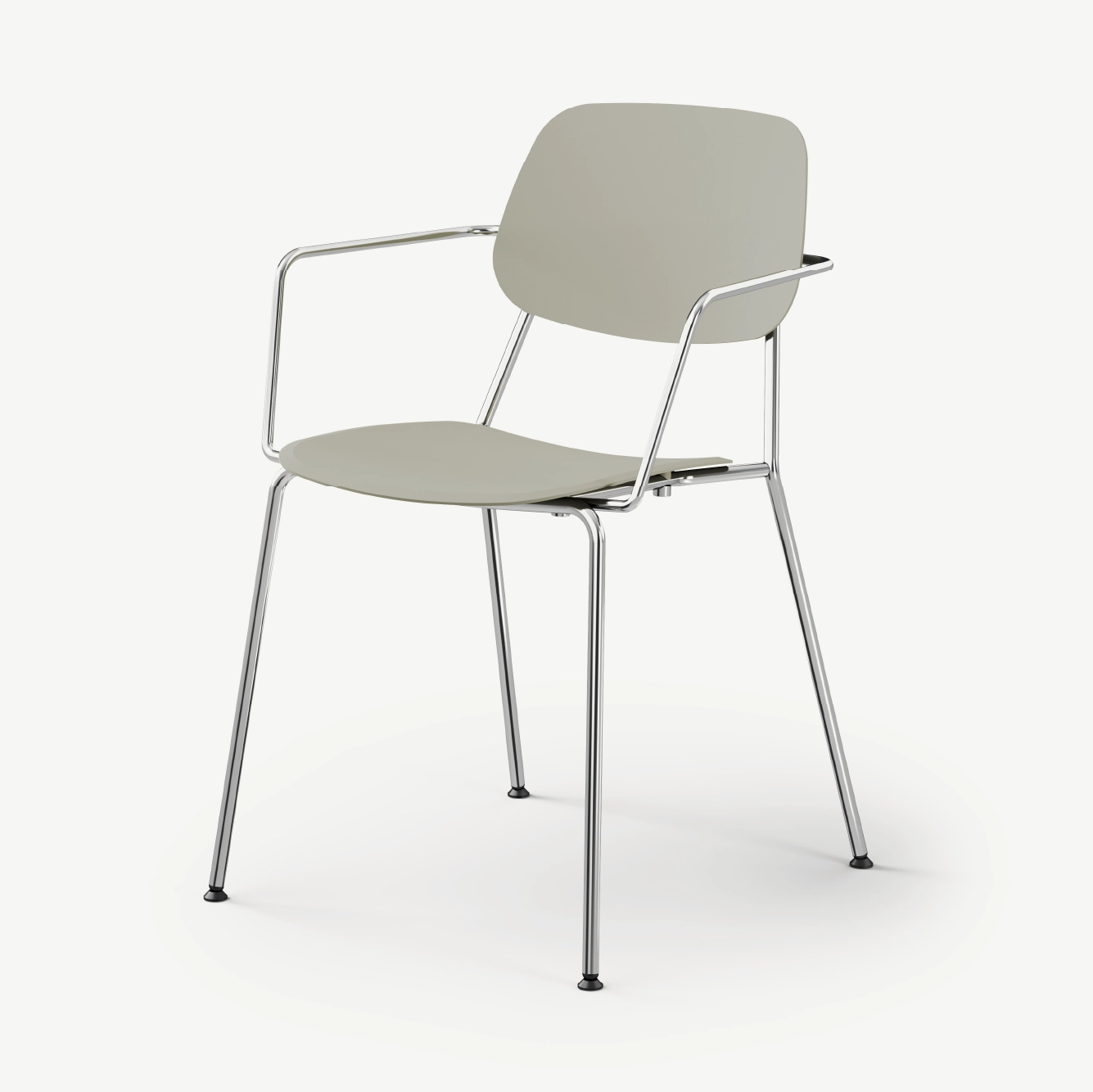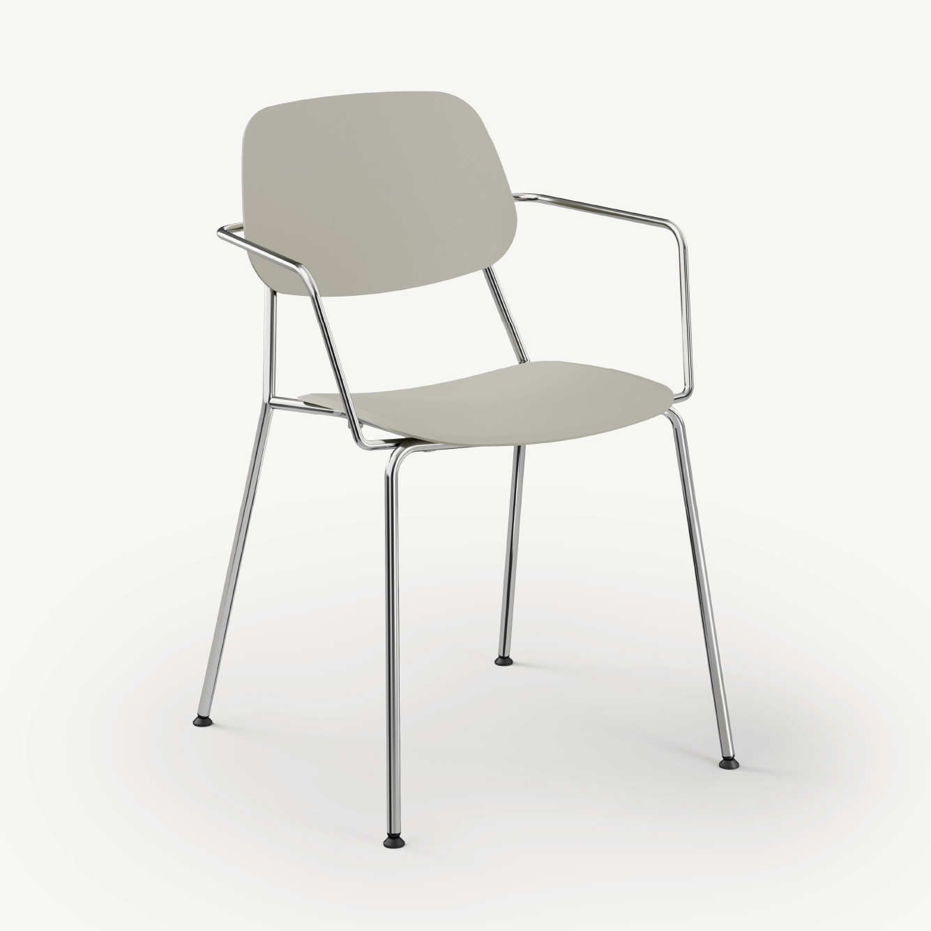 Il risultato è una seduta compatta, impilabile, disponibile anche con braccioli. Le scocche di schienale e sedile sono disponibili in quattro varianti colore – nero, grigio, verde e rosso – oppure in Bio-lolla nella finitura naturale. Per una maggiore personalizzazione possono essere anche tappezzate.